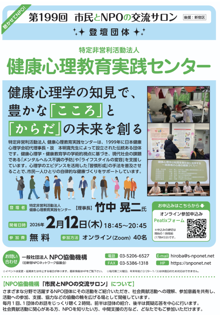 新宿NPO協働推進センター主催の【市民とNPOの交流サロン第199回・無料】におきまして、特定非営利活動法人 健康心理教育実践センターの活動紹介を行います。開催日時は、2月13日(木)18:45〜20:45で、オンライン(無料)で実施されますので、どうぞ皆様にご周知いただけましたら幸いです。